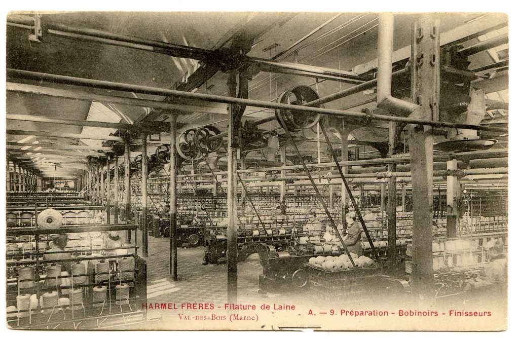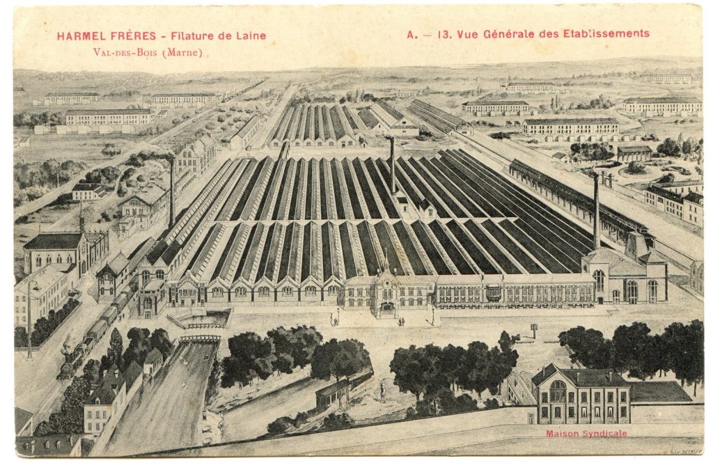 La famille Harmel, d’origine belge, a installé une filature de laine peignée en 1840 dans une région boisée le long de la Suippe et qui prendra le nom de “Val des Bois”. Malgré plusieurs incendies et destructions lors de la guerre 14-18, l’établissement qui a compté plus de 600 ouvriers a perduré jusqu’en 1980, définitivement condamné par la crise économique du textile.